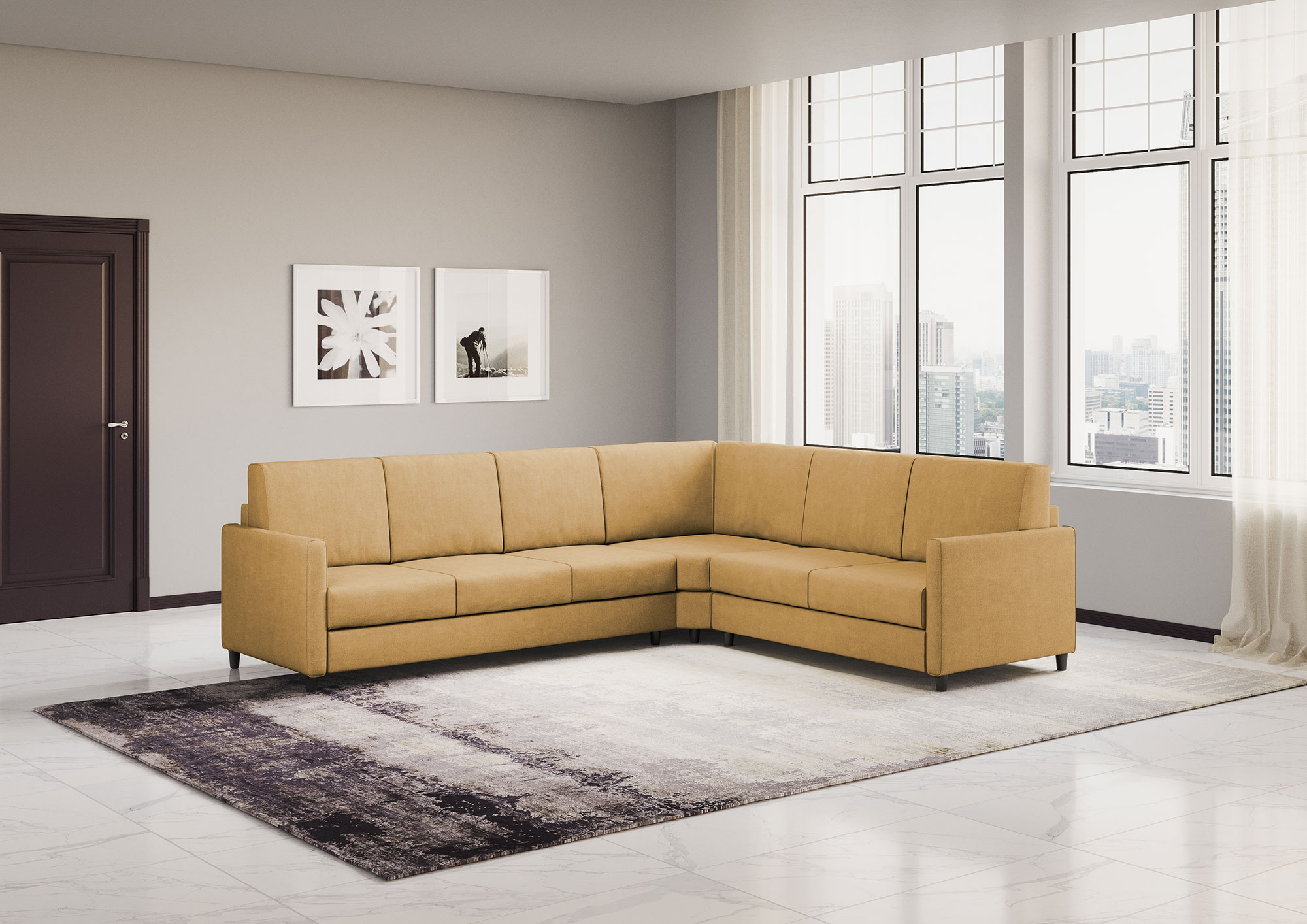Divano Karay 3 posti (tre sedute da 60cm)+ angolo + divano 2 posti medio (due sedute da 70cm) misure esterne L.281×241 colore ocra
