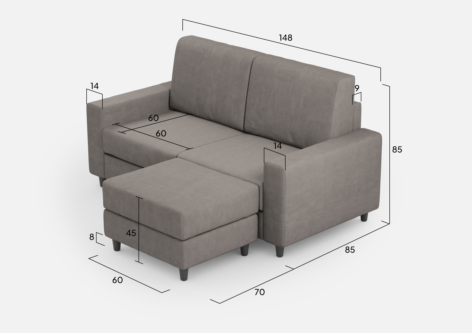 Divano Sakar 2 posti (due sedute da 60cm) + pouf misure esterne L.148 P.155 colore grigio