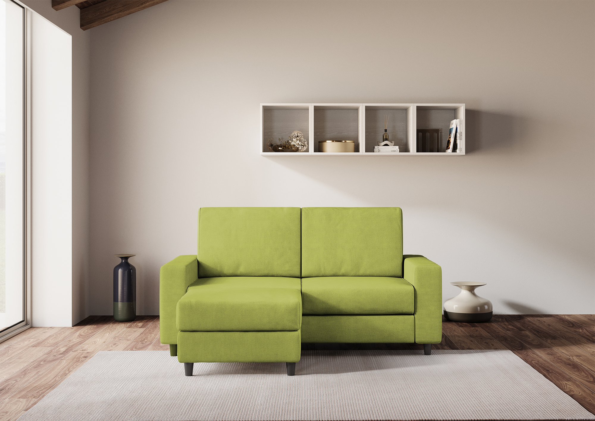 Divano Sakar 2 posti (due sedute da 60cm) + pouf misure esterne L.148 P.155 colore verde