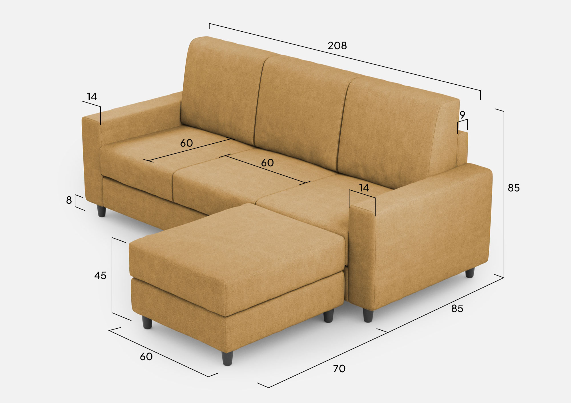 Divano Sakar 3 posti (tre sedute da 60cm) + pouf misure esterne L.208 P.155 colore ocra