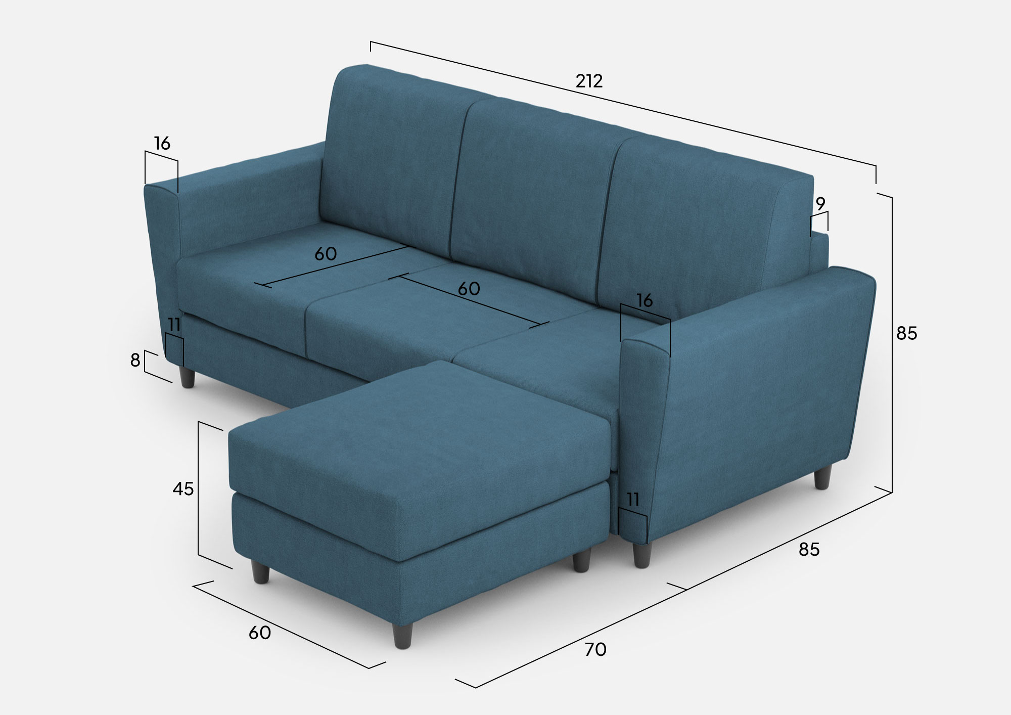 Divano Yasel 3 posti (tre sedute da 60cm) + pouf misure esterne L.212 P.155 colore avio