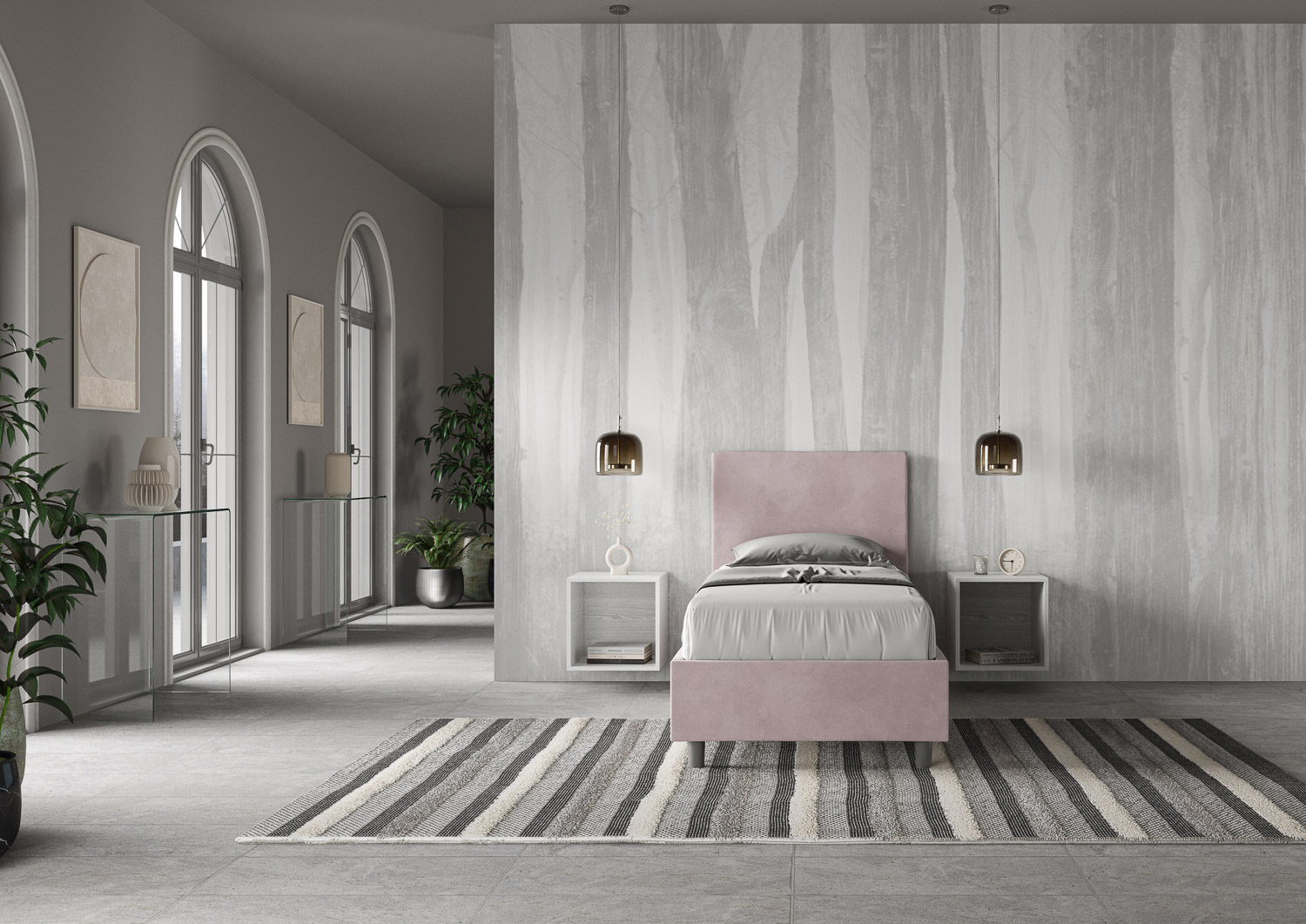 Letto singolo modello Adele con giroletto imbottito. Il modello Adele si presta da portavoce per uno stile semplice e raffinato. La superficie della testata liscia vi consentirà di collocarlo facilmente in qualsiasi ambiente, arredandolo con un tocco di classe e qualità del tutto italiana. Anche la pulizia del materiale in microfibra, di cui è interamente rivestito, è estremamente semplice, in quanto vi basterà passare una spugna con del sapone neutro delicato, attraverso movimenti circolari, per mantenere il suo fascino nel corso degli anni. Letto fornito con rete a doghe, predisposto per materasso L.80 P.200